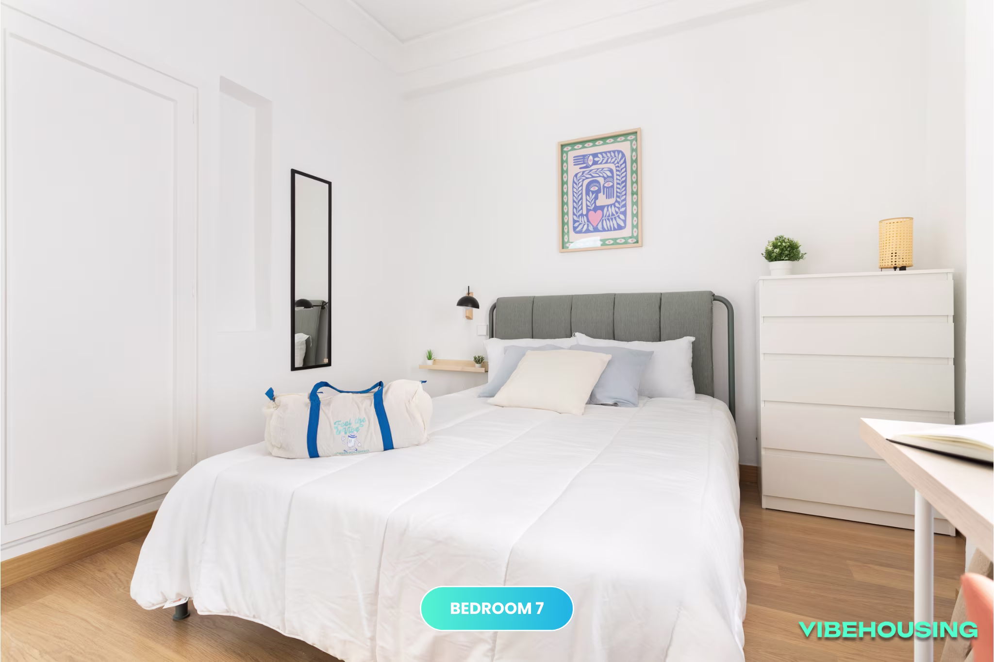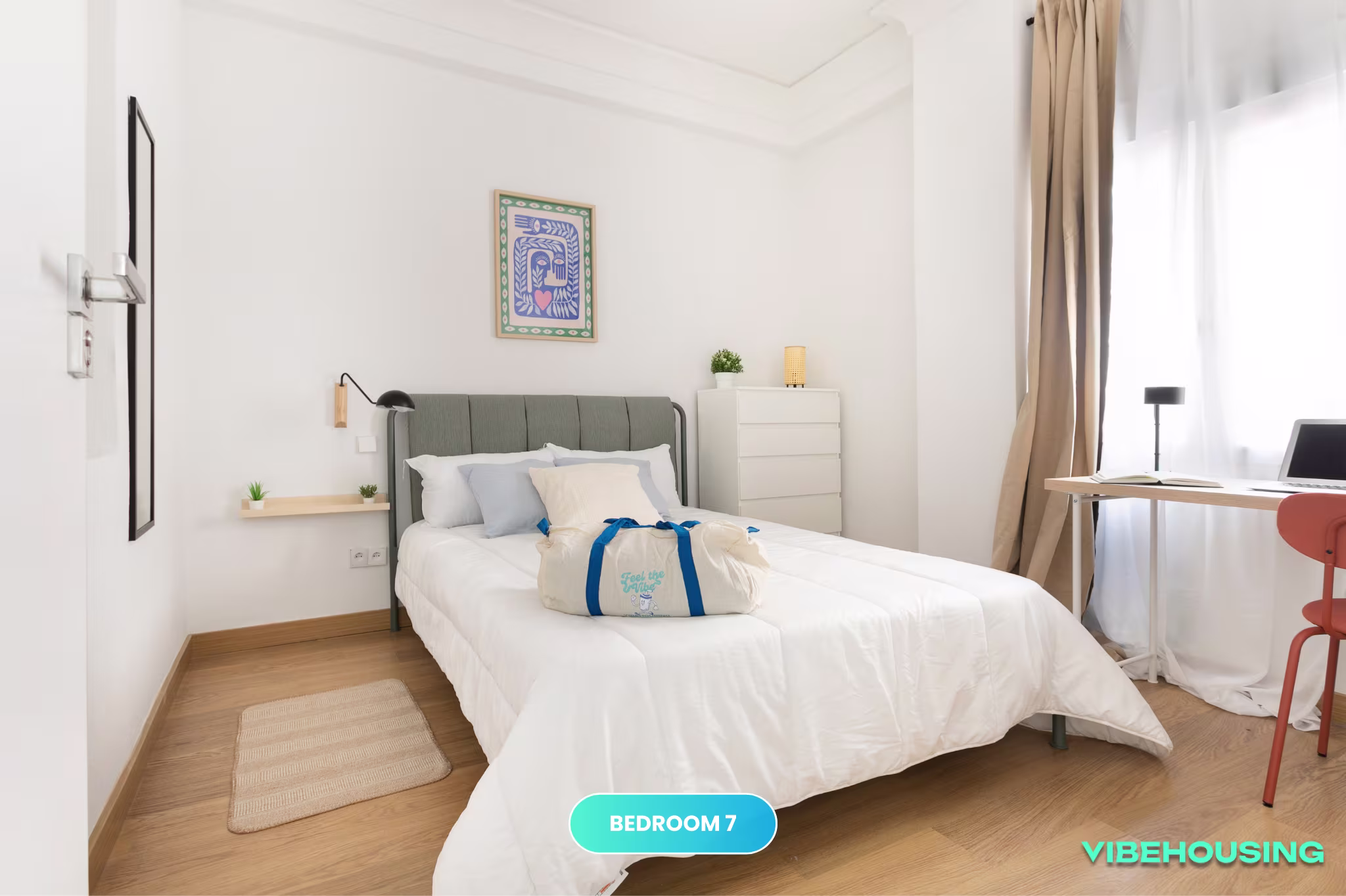 Esta habitación exterior de 12 m² es ideal para quienes buscan un espacio bien distribuido y con buena iluminación natural. Equipada con cama de 135 cm, escritorio, silla y armario, es perfecta para estudiantes y jóvenes profesionales que buscan tranquilidad y confort en un coliving moderno.