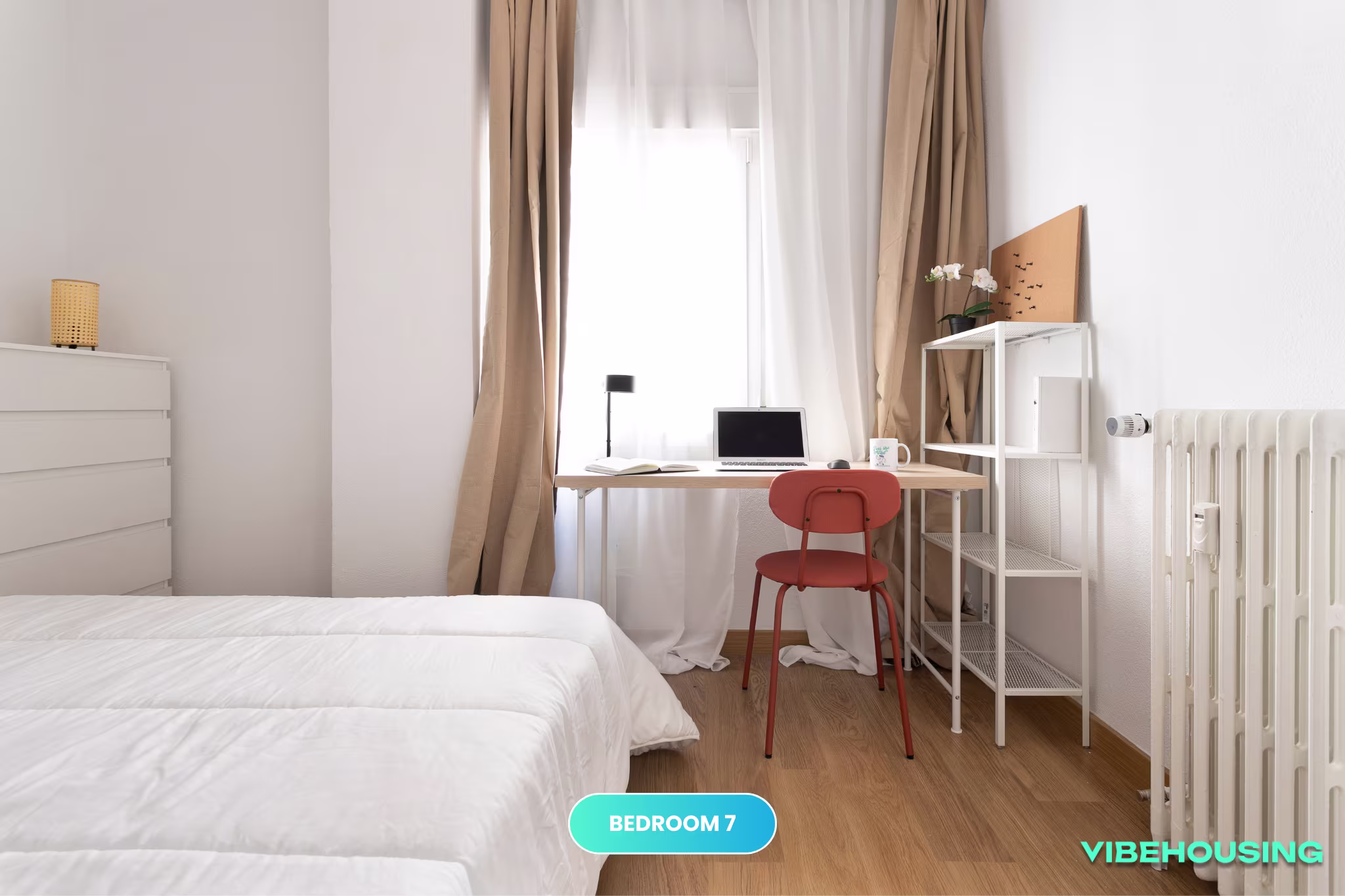 Esta habitación exterior de 12 m² es ideal para quienes buscan un espacio bien distribuido y con buena iluminación natural. Equipada con cama de 135 cm, escritorio, silla y armario, es perfecta para estudiantes y jóvenes profesionales que buscan tranquilidad y confort en un coliving moderno.